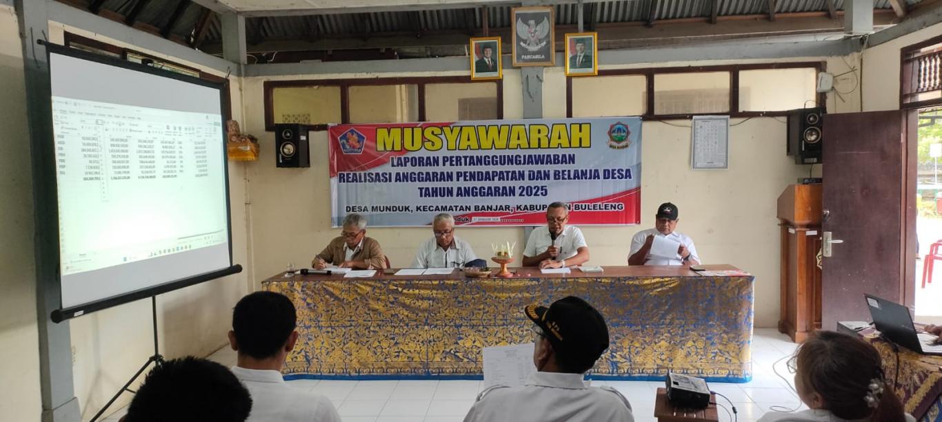Rabu, 21 Januari 2026 bertempat diruang Rapat Kantor Desa Munduk dilaksanakan Musyawarah Laporan Pertanggungjawaban Realisasi Anggaran Pendapatan dan Belanja Desa Tahun Anggarean 2025 Desa Munduk, pelaksaan Rapat Musdes diDampingi oleh Perbekel munduk beserta Anggota BPD dan Perangkat Desa Munduk